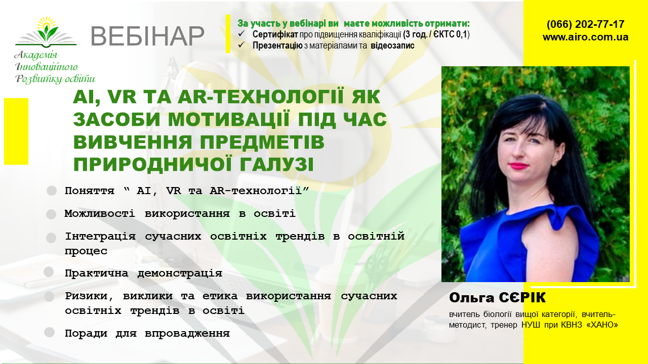 Нагадуємо Вам, що в четвер, 09.10.25р., о 16.00 год відбудеться вебінар “AI, VR та AR-технології як засоби мотивації під час вивчення предметів природничої галузі”.