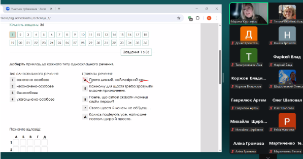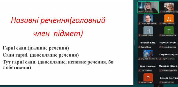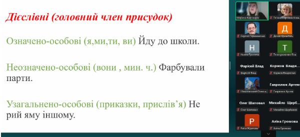 Під час вебінару учні разом із досвідченою наставницею детально розібрали класифікацію односкладних речень; опрацювали алгоритми розрізнення означено-особових, неозначено-особових, узагальнено-особових та безособових конструкцій; звернули особливу увагу на називні речення та їхні відмінності від двоскладних неповних.