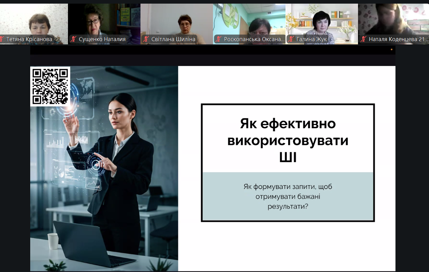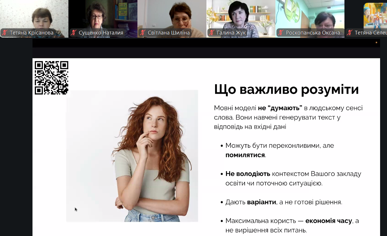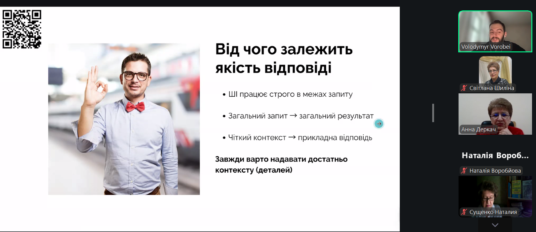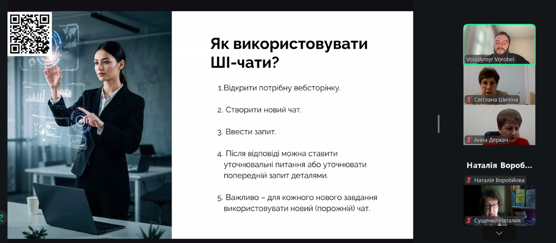 Модератор заходу Ганна Деркач, в.о. директора ЦПРПП, акцентувала увагу на актуальності саморозвитку педагога з питань цифровізації; зупинилася на +/- використання ШІ в освітньому процесі.