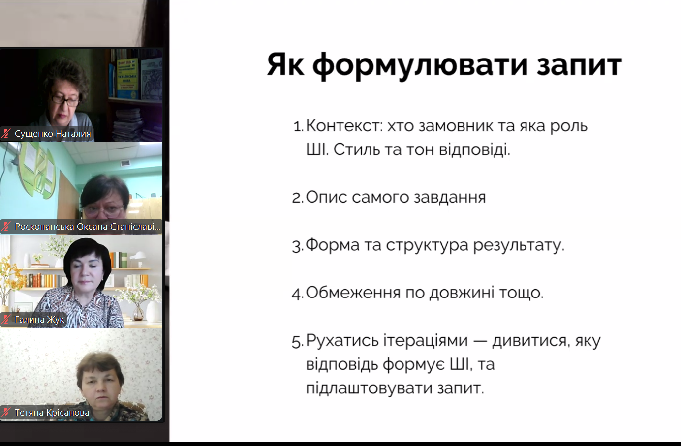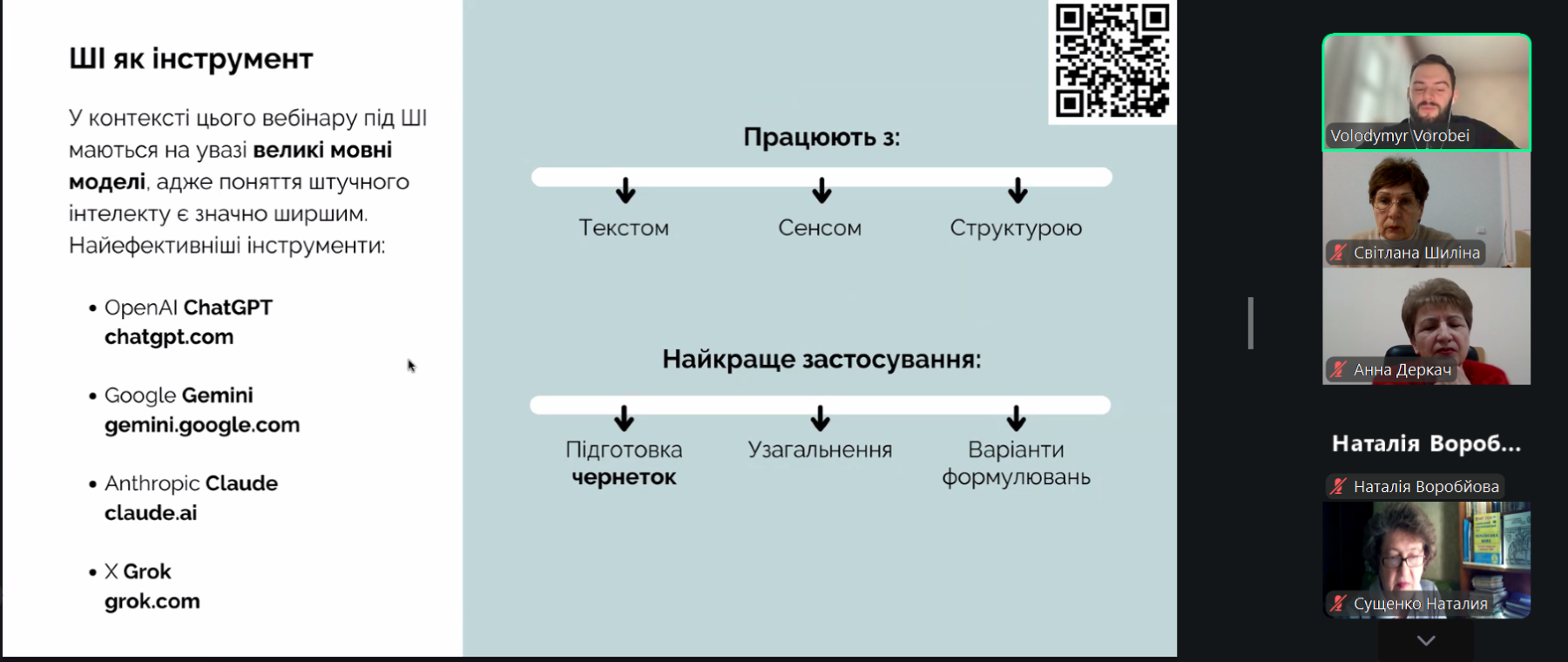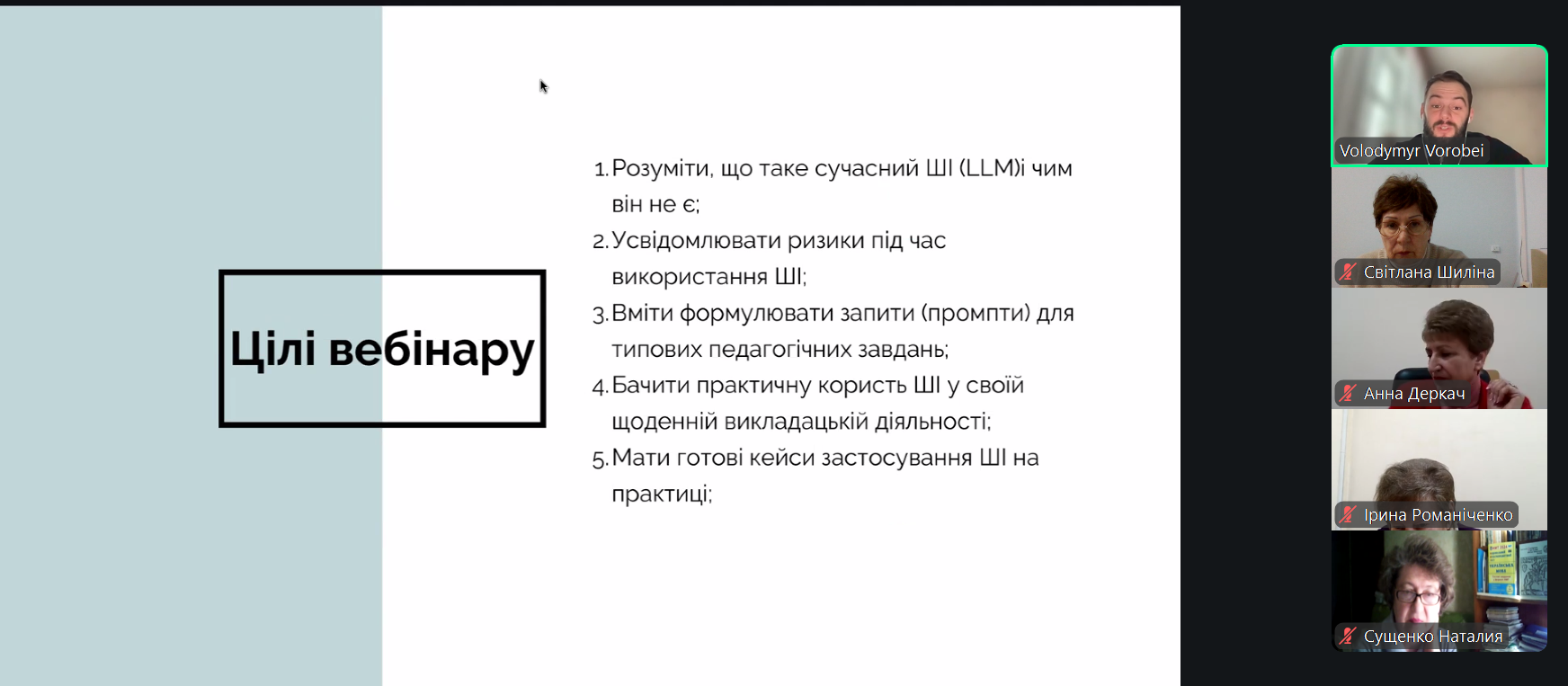 Модератор заходу Ганна Деркач, в.о. директора ЦПРПП, акцентувала увагу на актуальності саморозвитку педагога з питань цифровізації; зупинилася на +/- використання ШІ в освітньому процесі.