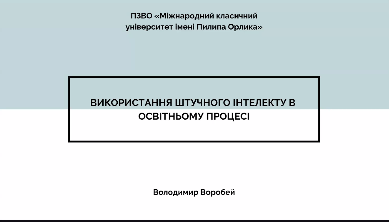 Спікер методінтенсиву Володимир Воробей, старший викладач ПЗВО «Міжнародного класичного університету імені П. Орлика», продемонстрував можливості практичного використання ШІ як інструменту вчителя та надав корисні поради щодо генерації навчальних матеріалів (пошуку методичних матеріалів та їх структуруванню, створення планів уроків, тестів, презентацій, зображень), автоматизації оцінювання робіт учнів, моніторингу успішності та прогресу здобувачів освіти в розрізі тем навчальної програми з метою виявлення проблемних питань та планування дій для поліпшення результатів тощо.