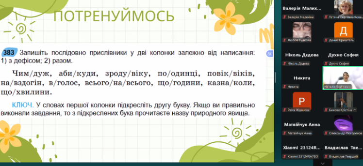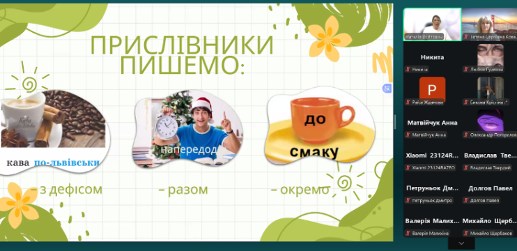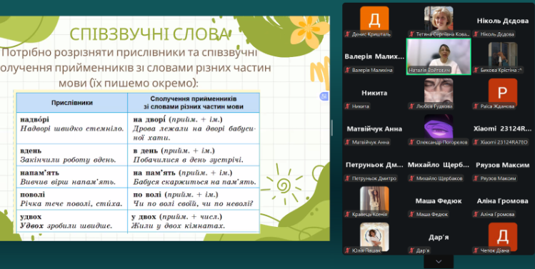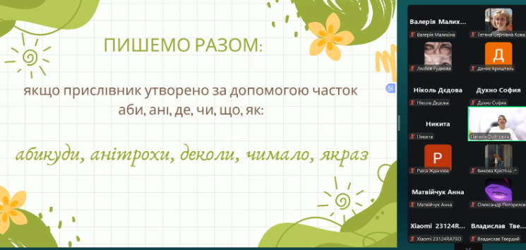 Під час вебінару учасники опрацювали основні групи прислівників за способом написання; навчилися розрізняти прислівники та однозвучні з ними сполучення; розглянули правопис найуживаніших прислівників-винятків, які найчастіше зустрічаються в тестах; розібрали правила вживання дефіса у складних прислівниках.