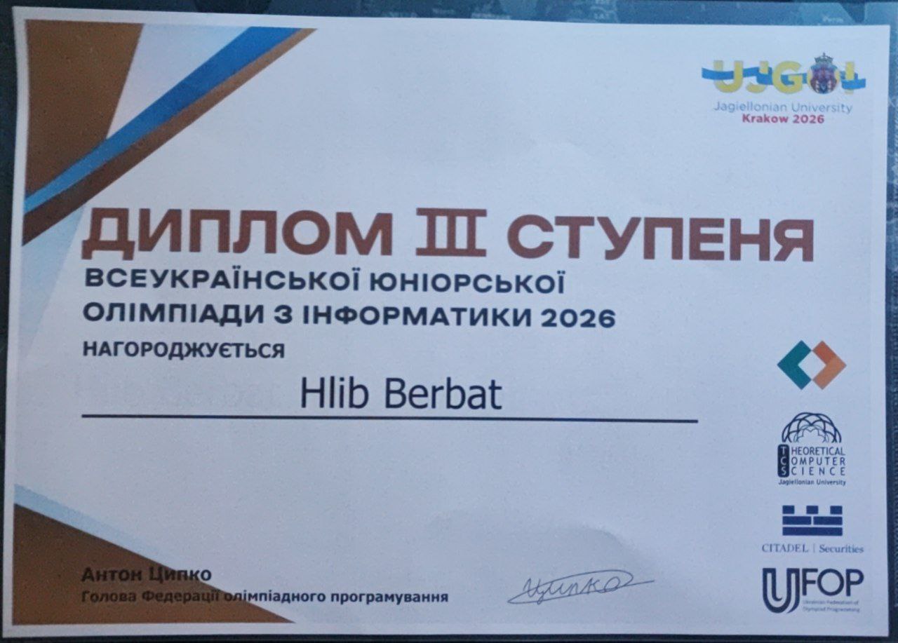 Бербат Гліб, учень 9 класу, отримав диплом переможця III ступеня.