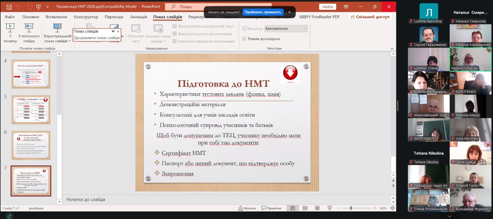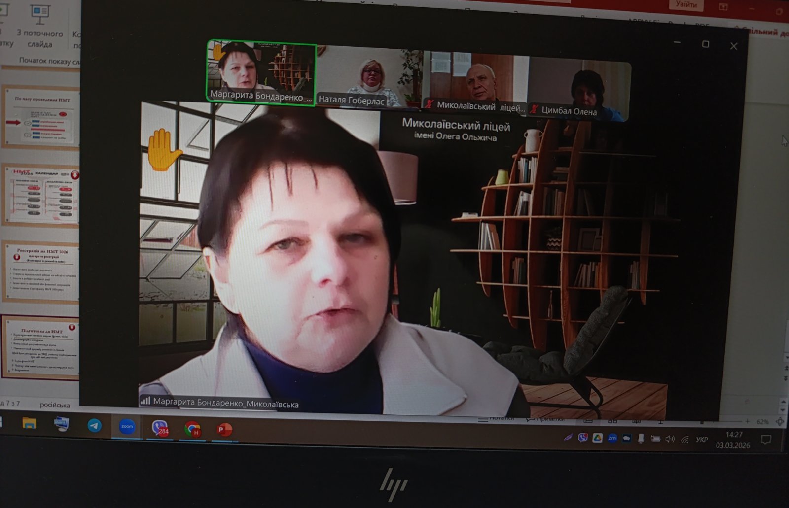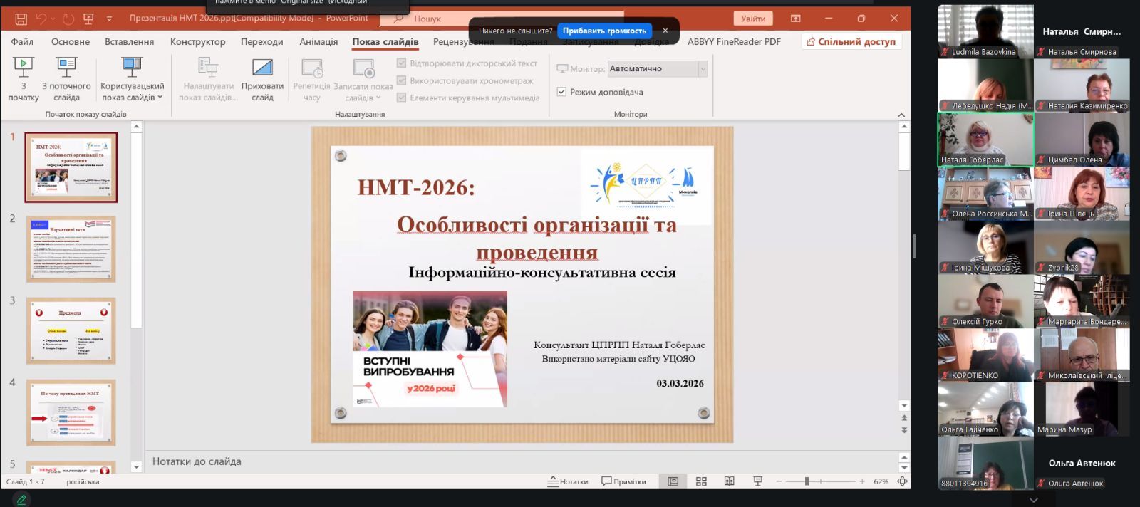 03.03.2026 консультантом ЦПРПП Н. Гоберлас проведено інформаційно-консультативну онлайн-сесію «НМТ-2026: особливості організації та проведення». Учасниками заходу стали 26 педагогів, в числі яких керівники ліцеїв міста, відповідальні особи з питань організації та проведення НМТ в закладах освіти.