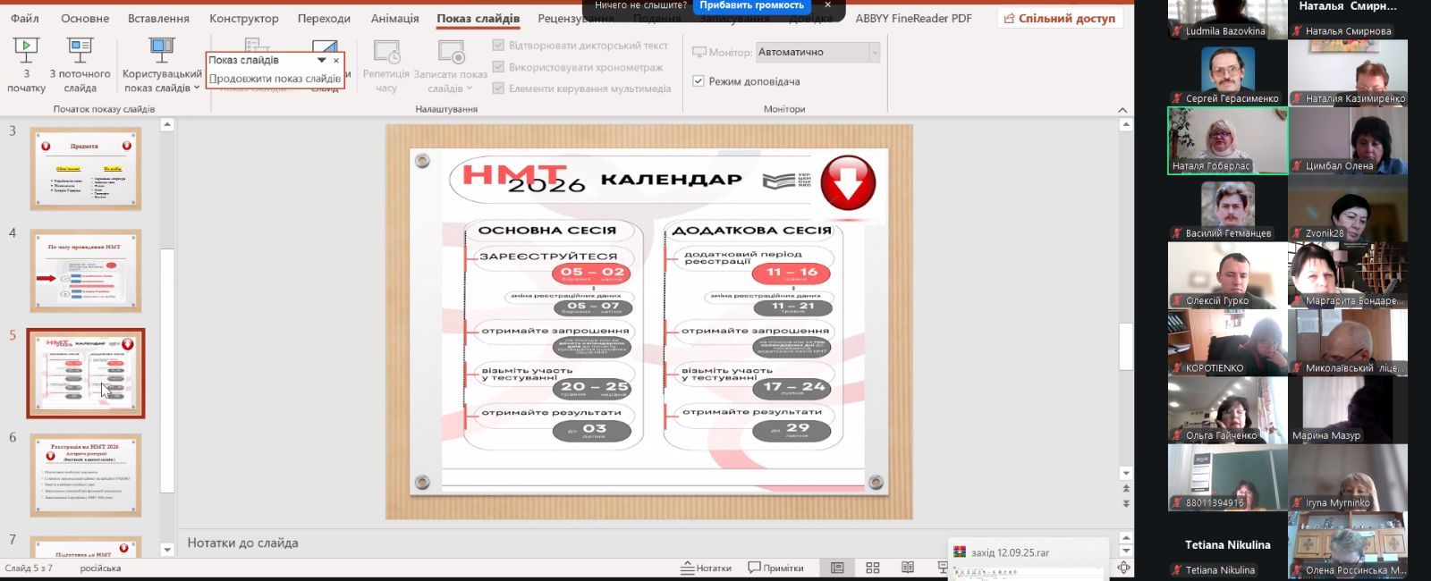 Під час зустрічі розглянули основні питання щодо організації та проведення тестування: календар НМТ-2026, алгоритм реєстрації учасника, оформлення документів, необхідних для реєстрації здобувачів освіти з ООП та тих, які навчаються за кордоном, важливість здійснення психологічного супроводу дітей під час налаштування та підготовки складання іспитів тощо. Акцентовано увагу представників закладів освіти на типові помилки під час реєстрації випускників та проходження ними тестування минулого року, необхідності проведення з випускниками та батьками інформаційно-просвітницької роботи щодо проведення НМТ та вступної кампанії в 2026 році.