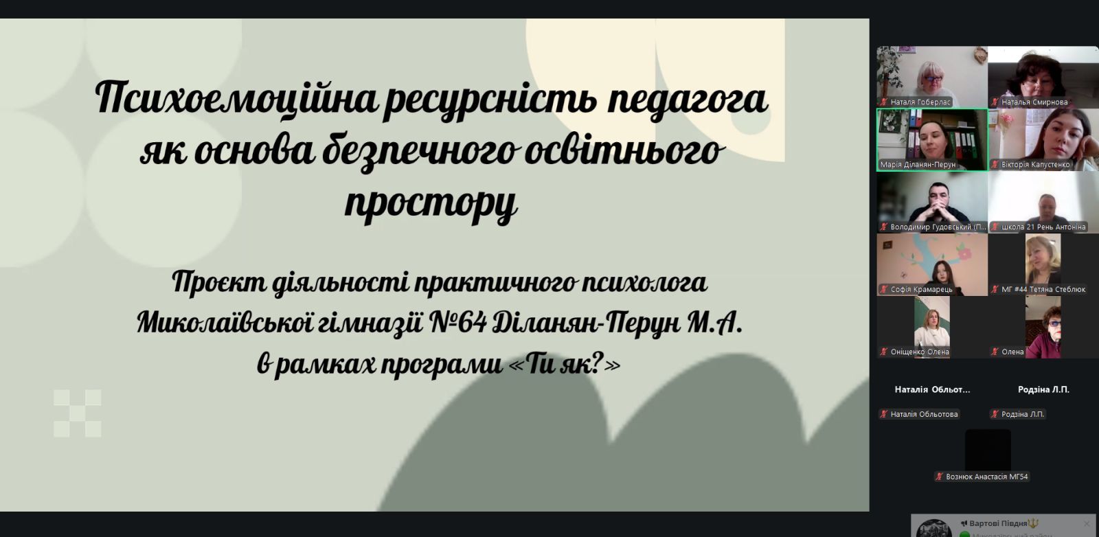 Своїм досвідом поділилася практичний психолог Г№64 М. Діланян-Перун, яка представила проєкт «Психоемоційна ресурсність педагога як основа безпечного освітнього простору (у контексті програми «Ти як?), метою якого є створення безпечного психологічного простору для педагогів шляхом розвитку їх психоемоційної ресурсності, профілактики емоційного вигорання та формування культури взаємної підтримки в педагогічному колективі. В закладі впевнені, що турбота про педагога – це інвестиція у дітей, освіту та майбутнє суспільства.