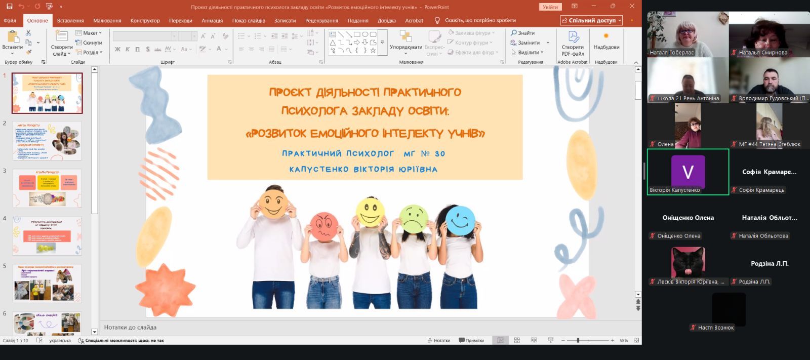 На початку зустрічі консультантом ЦПРПП Н. Гоберлас презентовано е-збірку «Освітні проєкти: успішні практики» (І частина), в якій представлені матеріали роботи ЦПРПП з даного питання та кращі практики 10 закладів закладів загальної середньої освіти міста Миколаєва (МЛ№8, 9, МГ№15, 26, 30, 36, 46, 50, 54, 64) щодо ефективності впровадження проєктів в управлінську діяльність закладу освіти, серед яких три роботи практичних психологів закладів освіти (МЛ№9, МГ№30, 64).