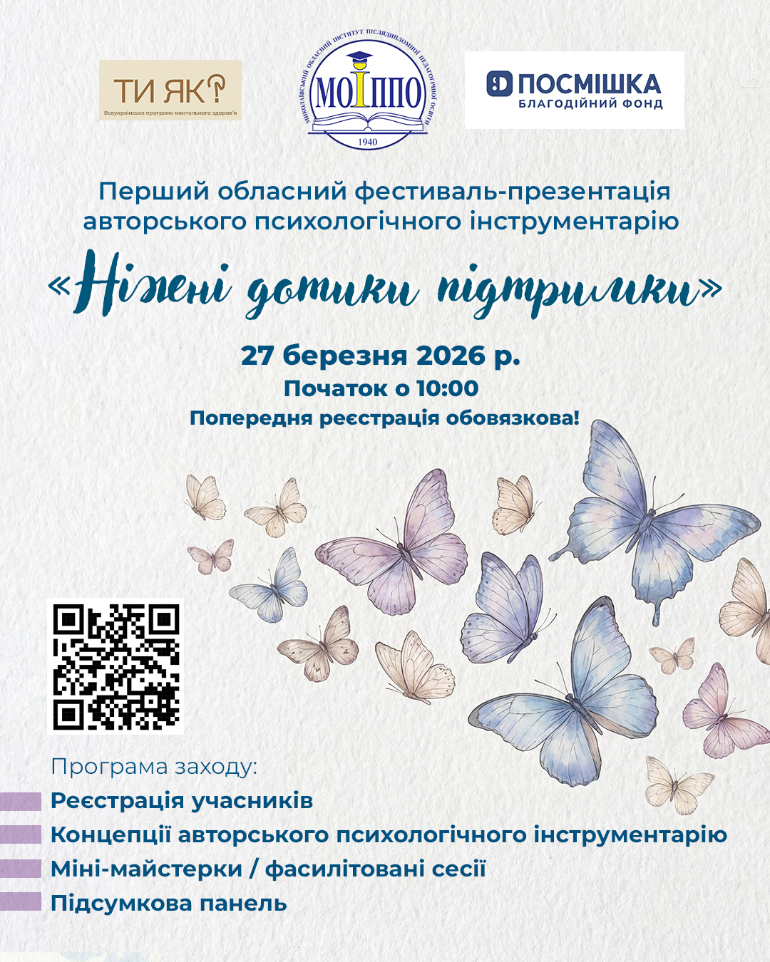 Миколаївський обласний інститут післядипломної педагогічної освіти інформує, що 27 березня 2026 року в очному форматі проходитиме І обласний фестиваль-презентація авторського психологічного інструментарію «Ніжні дотики підтримки».