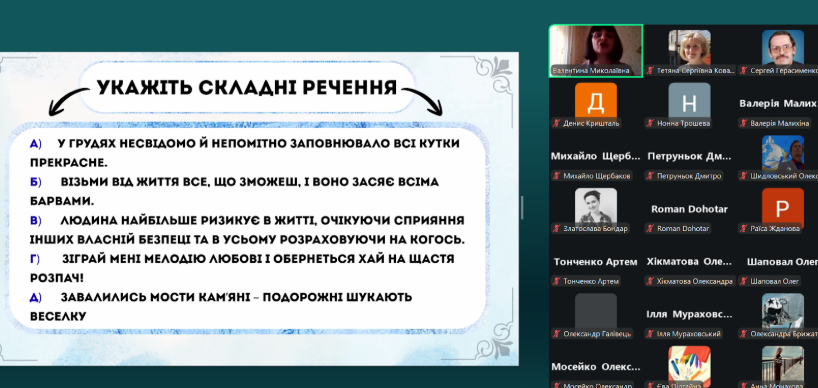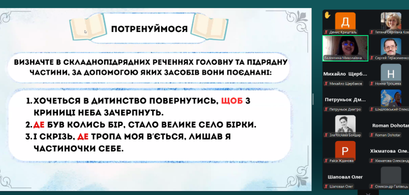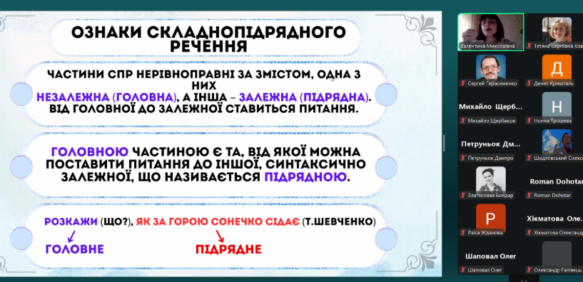 Разом з учителем учасники пригадали, як відрізнити підрядний зв’язок від сурядного та правильно визначити головну та залежну частини; розмежування сполучників та сполучних слів; алгоритм визначення підрядної означальної частини, а також розібрали різні види завдань.