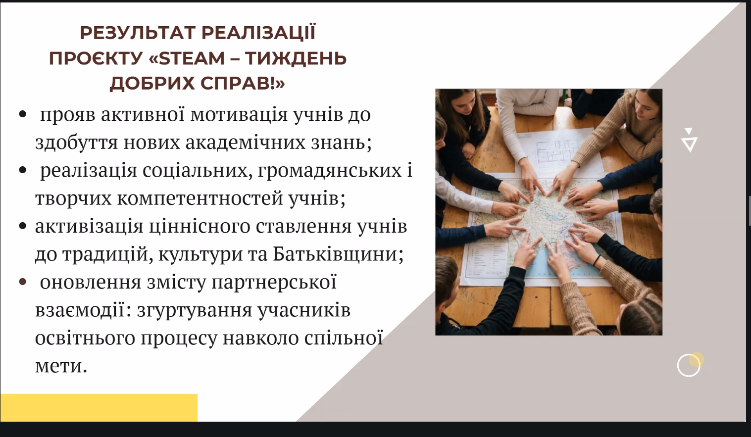 - Інтеграція складових STEAM з академічним і виховним змістом освітнього процесу (Миколаївська гімназія №50 ім. Г. Дівіної).